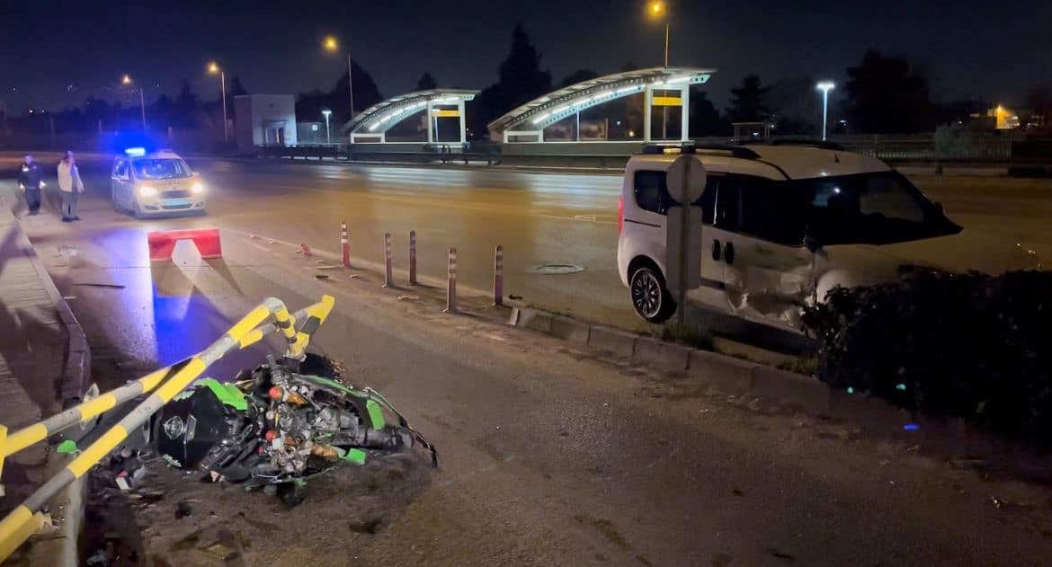 Bursa’da seyir halindeki motosiklet hafif ticari aracın çarpmasıyla demir korkuluğa uçtu. Lüks motosiklet kullanılamaz hâle gelirken, sürücüsü şans eseri hafif yaralandı.