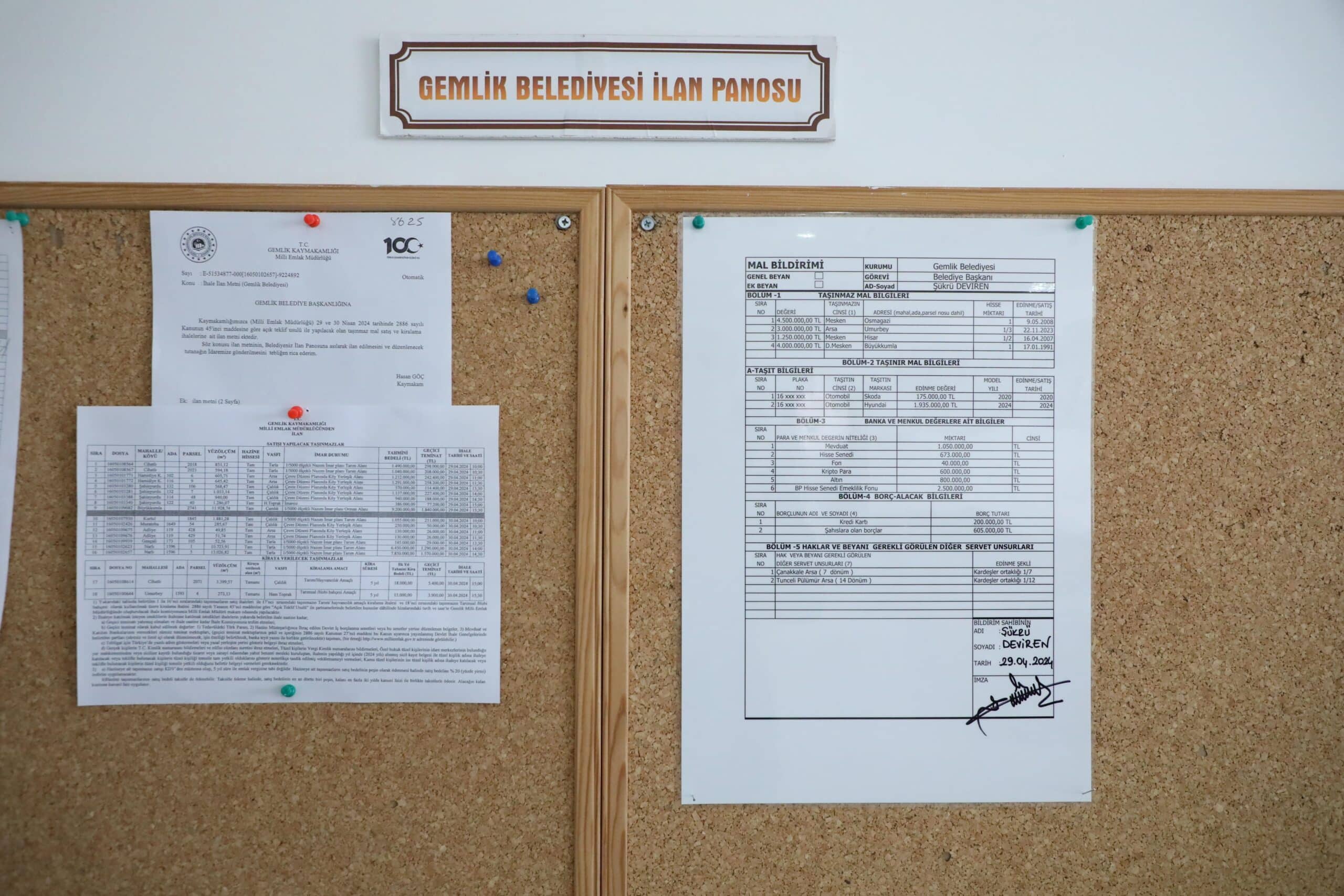 Gemlik Belediye Başkanı Şükrü Deviren, yaptığı halk toplantılarıyla görevine devam ediyor. Başkan Deviren, içerisinde çok sayıda kalemin bulunduğu mal beyanını açıklayarak belediyenin panosuna astı.