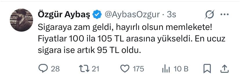 TÜRKİYE TEKEL BAYİLERİ PLATFORM BAŞKANI Özgür Aybaş, sigara fiyatlarına zam geldiği hakkında sosyal medya hesabından açıklamada bulundu. Açıklamasında:” Sigaraya zam geldi, hayırlı olsun memlekete! Fiyatlar 100 ila 105 TL arasına yükseldi. En ucuz sigara ise artık 95 TL oldu.” ifadesini kullandı.